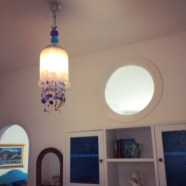 Opal Murano pendant lamp with blue and turquoise Murano beads and cascade of multicolor crystal pendants